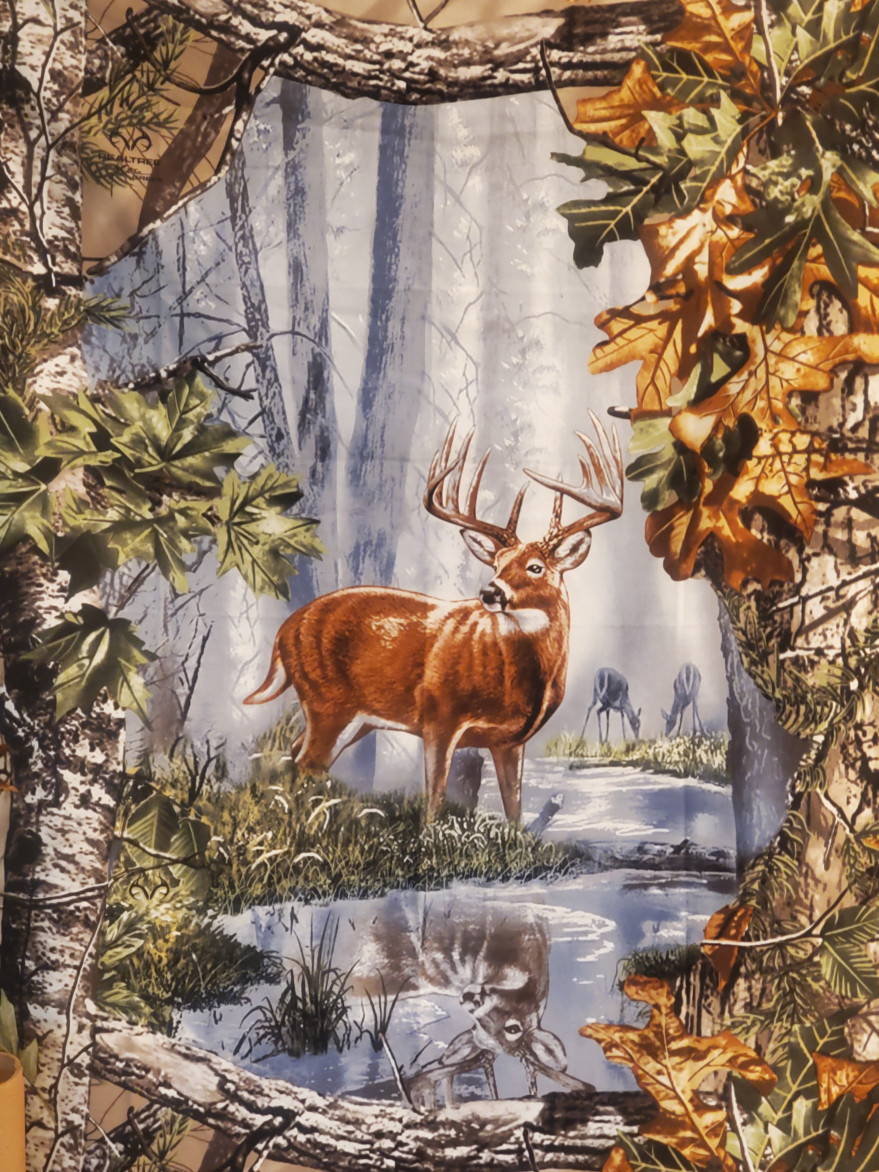 When I was browsing quilt fabrics online, I found a couple of panels picturing deer in the woods and decided to use one to make a quilt for my husband. The finished quilt will measure 60” wide by 90” long. The panel measures roughly 35” x 45” so I need to add a couple of rows of blocks to it.