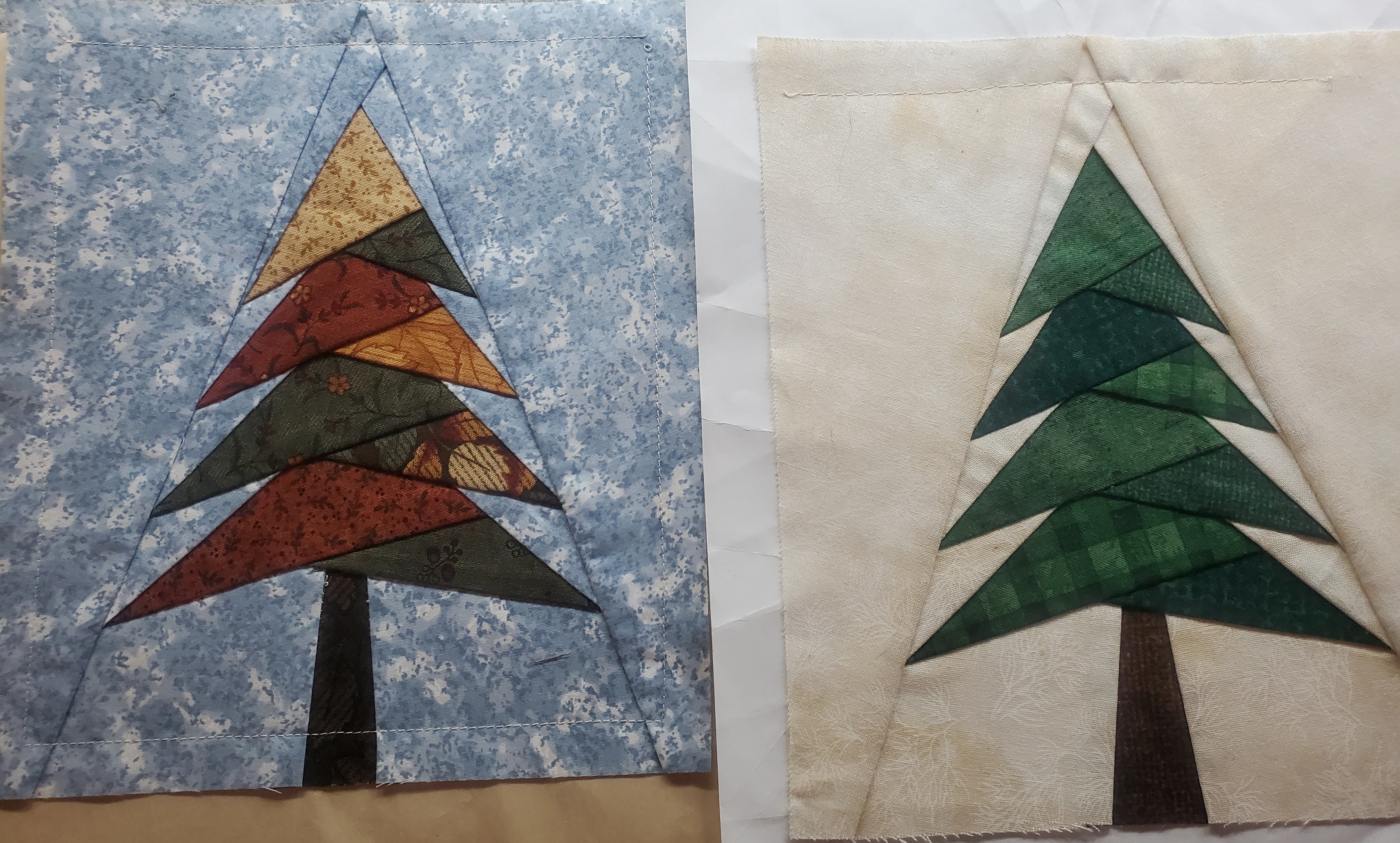 The other two rows will consist of foundation paper-piecing trees that I have used before. I’m using a free pattern I found online, enlarged just enough to get a 6” x 9” tree block. I printed enough to make two tree rows and a couple of extras in case I mess up. I’ll add a ½” borders between each block. A 1” border will go between this row and the star row. This should give me at least 90” in length.
