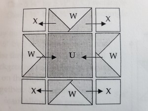 To get the 90” length, I will add four rows of pieced blocks, two directly above and two directly below the panel. Star blocks will be 4-1/2” squares. I will need ten or eleven for each of the two star rows. I will make 22, just in case. I cut 22 2-1/2” squares, 176 1-1/2” squares, 88 rectangles 1-1/2 x 2-1/2”, and 88 1-1/2” squares. I marked each of the 176 1-1/2”squares with a diagonal line using a fabric pen. Now the star blocks are ready to assemble. I’ll add a ½” border on either side of the star blocks.